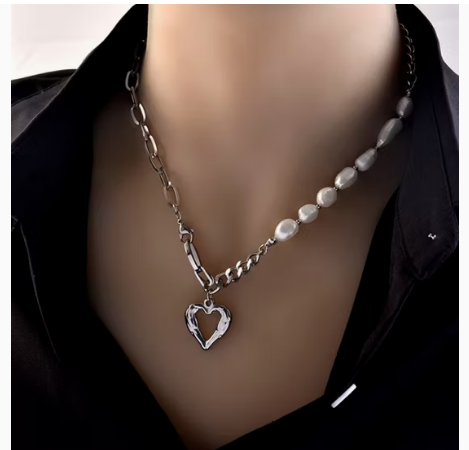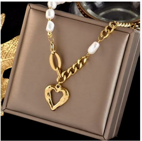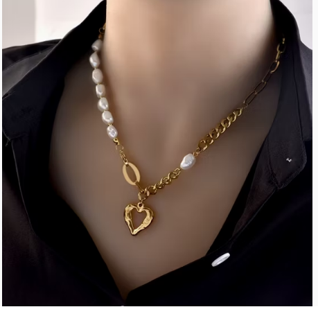 Women Chunky Fashion Jewelry Patchwork Chain Heart Pendant Baroque Freshwater Pearl Necklace.