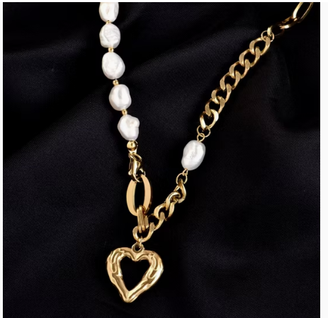 Women Chunky Fashion Jewelry Patchwork Chain Heart Pendant Baroque Freshwater Pearl Necklace